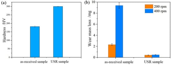 The hardness (a) and wear mass loss (b) of the USR sample, compared to as-received sample.