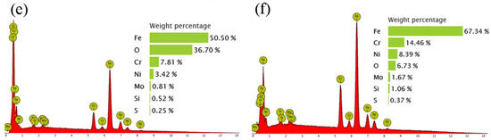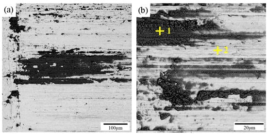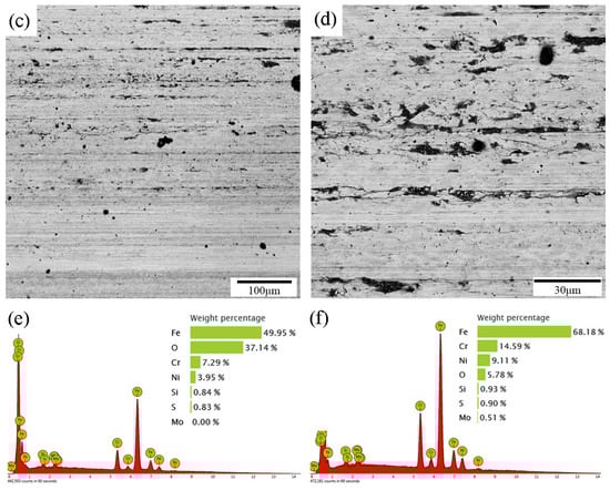 SEM observations and EDS analysis of the worn surfaces were conducted to understand the material removal and dissection of the wear mechanisms. Figure 6 and Figure 7 show SEM micrographs of the typical worn surfaces of the USR sample and the as-received sample at two different wear speeds, respectively. At a low speed (200 rpm), both the as-received and the USR samples displayed abrasive wear and oxidation, marked by the obvious furrow trace and a large oxidation zone, as shown in Figure 6a,b and Figure 7a,b. The obviously increased oxygen content in the black zone on the wear track implied the occurrence of oxidation induced by friction heat, as shown in Figure 6e,f and Figure 7e,f. A trivial plastic flow was also discernible, implying the occurrence of mild adhesive wear. At a high speed (400 rpm), the relatively smooth wear track and furrow trace demonstrated slight adhesive wear and abrasive wear for the USR sample, as illustrated in Figure 6c,d. In contrast, severe plastic flow and adhesive wear occurred on the wear tracks of the as-received sample, as shown in Figure 7c,d. The severe plastic flow and adhesion phenomena were related to the relatively low microhardness of the as-received sample, compared with its friction couple. The prevailing oxidation wear at a low wear speed was generally related to the initial oxidation film on the metal’s surface. Raw AISI 316 L stainless steel and its AISI 52100 steel friction couple were covered by an oxidation film. Therefore, wear indeed occurred between the two oxidation films at a low speed, and thus the oxidation prevailed, but the wear mass loss was low. Increasing the wear velocity led to a direct metal-to-metal contact. Thus, the abrasive wear became dominant, accompanied by a high wear mass loss. These findings were consistent with those from a previous report on the wear of steel [33].