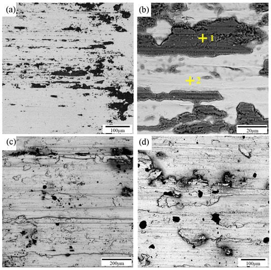 SEM images of the typical worn surfaces of the USR sample at 200 rpm (a,b) and 400 rpm (c,d). The right-hand graph is an enlargement of the left-hand graph. The result of EDS analysis (e,f), obtained from the region marked by 1 and 2 in (b).