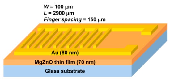 Schematic of designed Au−MgxZn1−xO photodetector on glass substrate with metal-semiconductor-metal (MSM) structure.