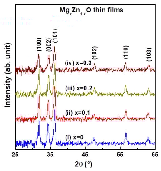 It is well known that the diffraction peak broadening of polycrystalline metal oxide thin films is associated not only with crystallite size reduction but also lattice strain induced in the thin films []. While the ionic radii of the dopant Mg2+ (0.057 nm) is relatively smaller than that of the host Zn2+ (0.060 nm), some Zn2+ ions in the crystal lattice of the host oxide material were easily replaced by Mg2+ ions (>30 at.%) without changing the crystal structure, proving the possibility of MgZnO solid solution formation [,]. The substitution of Mg2+ ions for Zn2+ ions slightly distorted the lattice of the ZnO crystal. Such lattice distortion may facilitate the formation of ZnO crystal nuclei and inhibit grain growth, leading to the obtained MgZnO thin films having a microstructure finer than that pure ZnO thin film. In addition, a slight shift of the (100) peak toward a lower diffraction angle region and the (002) peak toward a higher diffraction angle region were found with an increase in Mg content, indicating changes in the lattice parameters (a-axis and c-axis lengths) after Mg was incorporated into ZnO crystals [,].