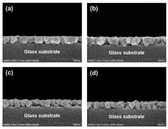Figure 3 shows cross-sectional FE-SEM micrographs of sol-gel derived MgxZn1−xO thin films on glass substrates. The film thickness of each oxide thin film sample was estimated from the corresponding FE-SEM micrograph. The mean film thicknesses of the ZnO (Figure 3a) and MgZnO (Figure 3b–d) thin films were 72 and 70 nm, respectively. As can be seen from the FE-SEM micrographs, these obtained ZnO-based thin films had a significantly granular microstructure, and nano-sized pores formed inside the polycrystalline oxide thin films. Kim et al. reported that the formation of nano-sized pores inside the sol-gel derived ZnO-based thin films were related to the thermal decomposition of the precursors and residual organics in dried sol-gel films []. The presence of nano-sized pores is one of the major reasons why the electrical properties of solution-processed oxide semiconductor thin films are inferior to the sputtered oxide semiconductor thin films. However, the solution-processed oxide thin films exhibited a porous microstructure and had relatively large grain boundary areas, which could make them applicable as the sensing layer in sensors and detectors []. In addition, it can be clearly seen in Figure 3 that the particle sizes were significantly affected by the Mg content. The plane-view FE-SEM micrographs showed a similar microstructural feature with the cross-sectional FE-SEM micrographs (Figure S2). The average grain sizes of the MgxZn1−xO thin films, as determined from plane-view FE-SEM micrographs, were 43.4, 42.0, 38.9, and 37.6 nm for x = 0, x = 0.1, x = 0.2, and x = 0.3, respectively. The observation of the structural features of the films by FE-SEM was in good agreement with the XRD results.