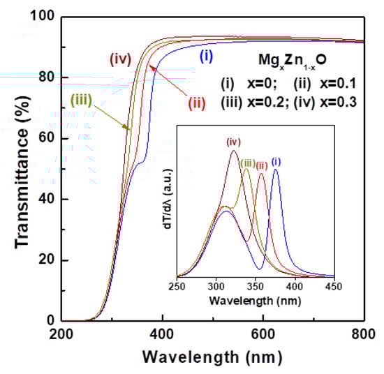 The optical properties of the functional oxide thin film in the visible and UV light regions are important factors in photodetector applications. Figure 4 depicts the optical transmittance spectra of the glass/MgxZn1−xO thin film samples in the wavelength range of 200–800 nm. Each transmittance spectrum exhibited high transparency (>91%) in the visible region and a steep absorption edge in the UV region. Moreover, the transmittance was almost zero when the wavelength was less than 250 nm. The average transmittances of the MgZnO thin films (>92.0%) were slightly higher than that of the ZnO thin film (91.3%) in visible light of 400 to 800 nm due to a flatter surface and lower reflectance (Figure S4). The high visible light transmittance was due to weak absorption and a slight scattering of the obtained ZnO-based thin films, which make them suitable for application in transparent circuitry and invisible electronics. Plots of the first derivative of the transmittance (dT/dλ) versus wavelength are presented in the inset of Figure 4. The peak value for each curve provided a corresponding absorption band edge (cut-off wavelength) of the oxide films, the value of which significantly shifted towards the lower side with increasing Mg content, indicating blue-shift behavior. In addition, a tail−like bow was observed in the absorption edge region; this feature is related to the presence of structural defects such as grain boundaries and interstitial sites []. The comparatively low transmittance coefficient in the UV light region (Figure 4) was attributed to the high absorption rate because of the nature of the wide bandgap oxide semiconductor.