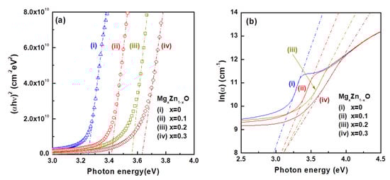 (a) Plot of (αhν)2 versus photon energy (hν) and (b) plot of ln(α) versus photon energy (hν) of MgxZn1−xO thin films.