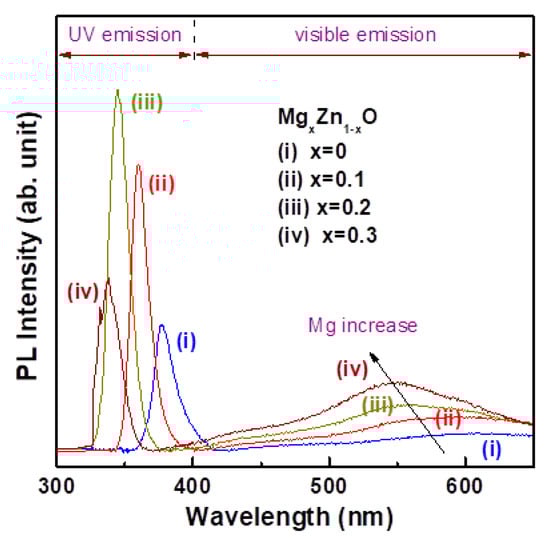 Room temperature photoluminescence (PL) spectra of nanocrystalline MgxZn1−xO thin films.