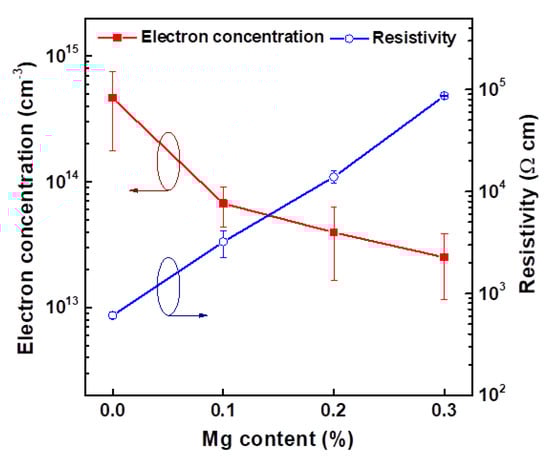 The electrical properties, including the major carrier concentration and electrical resistivity, of the MgxZn1−xO thin films were examined by Hall effect measurement and are presented in Figure 7. Measurement results showed that these thin film samples exhibited n-type conductivity. The mean electron concentration (n) decreased from 4.64 × 1014 to 2.51 × 1013 cm−3 with increasing Mg content, and the mean resistivity (ρ) rose from 6.08 × 102 to 8.68 × 104 Ω·cm because the electrical resistivity of semiconductor materials is almost inversely proportional to the major carrier concentration. Substitution of Mg2+ for Zn2+ has no significant contribution to the cation charge in ZnO. Singh et al. demonstrated that the sol-gel synthesized MgZnO films with porosity attributing to relatively high resistivity level []. Mg incorporated into ZnO crystals not only increased the grain boundary area to form electrical barriers and scattering of the carriers but also decreased the oxygen defects as the Mg–O bond has a more ionic character than the Zn–O bond that reduced the electron concentration and simultaneously increased in resistivity [,,]. Cohen et al. have reported that increasing the Mg content from 0 to 20% could decrease the conductivity, mobility, and electron concentration in sputtered ZnO-based thin films []. Because the incorporation of Mg into ZnO led to an increase in the effective mass compared to ZnO.