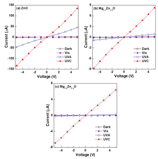 Current–voltage (I–V) characteristics of MgxZn1−xO photodetectors showing dark current and photoilluminated currents under irradiation with visible UVA and UVC light. The photodetectors were based on (a) ZnO, (b) Mg0.1Zn0.9O, and (c) Mg0.2Zn0.8O semiconductor thin films.