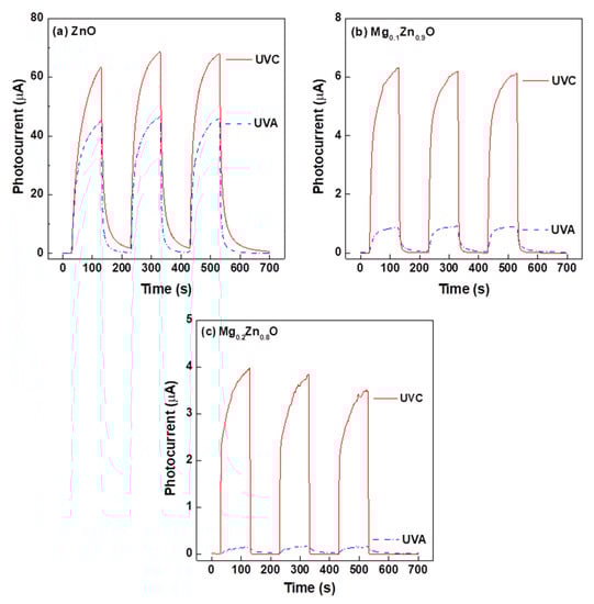 Due to the low electron concentration density (~2.51 × 1013 cm−3), the time-dependent photoresponse of the Mg0.3Zn0.7O photodetectors was not measurable in this study. Moreover, with these as-synthesized MgxZn1−xO thin films, a photogenerated current was hard to detect for wavelengths of light longer than 400 nm because their bandgap energies were higher than 3.25 eV. Figure 9 shows the time-dependent photoresponse characteristics of ZnO, Mg0.1Zn0.9O, and Mg0.2Zn0.8O photodetectors under periodic UVA and UVC light illumination at a fixed bias of 5 V with an interval time of 100 s, revealing good periodic repeatability and reproducibility.