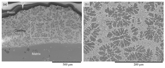 After being diffusion alloyed at 430 °C for 2 h with 10 g ZnO and 1 g NH4Cl as the diffusion source, a coating was fabricated on the AZ91D magnesium alloy specimen as shown in Figure 3a. It could be figured out that the thickness of the as-diffusion alloyed coating can be hundreds of micrometers. From a magnified photograph of the coating shown in Figure 3b, it could be observed that the coating contains multiple phases. Some phases have a network shape morphology, while other phases are embedded in the network. Dendrites could be observed clearly. The size of the dendrites embedded in the networks is estimated to be tens of micrometers to two hundred micrometers.