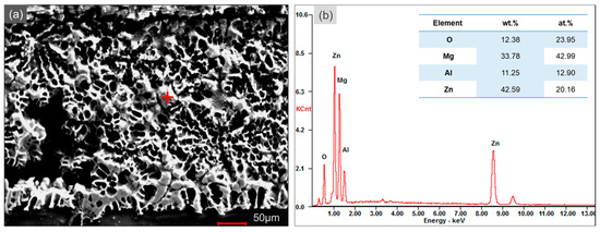 (a) The morphology of a cross-section of the intermetallic layer on a surface-alloyed AZ91D magnesium alloy specimen with zinc oxide as the only Zn donor in the diffusion source; (b) The EDS result of the point located at the cross marked in (a).