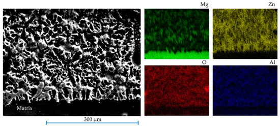 Morphology of a cross-section of the intermetallic layer on an as-surface-alloyed AZ91D magnesium alloy specimen obtained with zinc oxide as the Zn donor and the corresponding Mg, Zn, O, Al element maps.