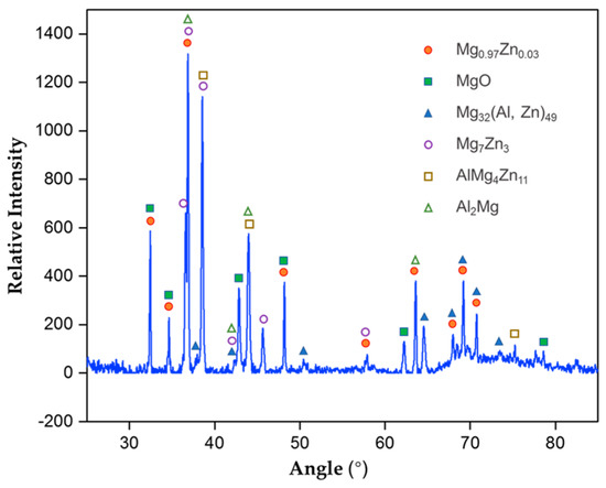From the XRD pattern shown in Figure 6, it could be figured out that there are Mg0.97Zn0.03, MgO, Mg32(Al, Zn)49, Mg7Zn3, AlMg4Zn11, Al2Mg phases in the as-diffusion-alloyed coating. MgO is inferred to be formed in the duration when the cross-section of the coating was exposed in the air, and other phases including Mg0.97Zn0.03, Mg32(Al, Zn)49, Mg7Zn3, AlMg4Zn11, Al2Mg are inferred to be in the original coating. Comparing with a binary alloy system, the constituent of a ternary alloy system is much more complex. According to the melting points, these phases would solidify one by one from the melt in the cooling process [16].