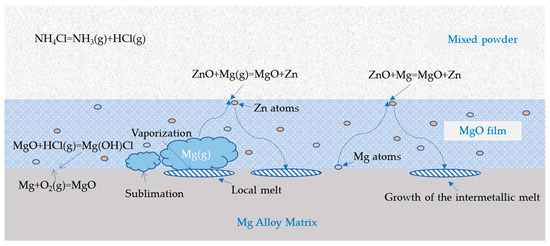 Meanwhile, oxidation of Mg is reported to occur at the interface between the MgO film and the air in a regular oxidation process of magnesium alloys [4,5]. In the diffusion alloying process here, the MgO film contacted with the mixed powder which contains ZnO directly, thus it is possible for the active Mg atoms to pass through the MgO film and react with ZnO to produce Zn atoms as shown in Figure 7.