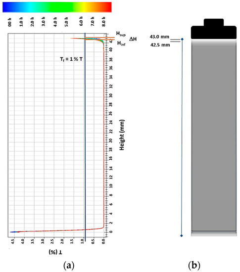 This study was carried out with a Turbiscan analyzer (mod. Lab. Expert, Formulation Co., Toulouse, France) using cylinder-shaped vials. The analysis of the obtained transmittance signals versus vial height was performed as described in Reference [19]. The scanning of the transmittance signal (T) along the height vial were periodically measured at pauses of 5 min for 8 h. Figure 1 shows a typical graph of the transmittance signals (T) vs. vial height. From the graphs T vs. vial height, the thickness of the diluted phase (ΔH (mm) = Hsup − Hinf) was calculated (see Figure 1). The Hinf (mm) value was acquired by measuring in the vial, the point of intersection between the transmittance (T) signal (as a function of vial height) obtained during the scan and the Tf value (Tf = 1% T). Tf is the maximum limit value of transmittance accepted. In this work, Tf was fixed arbitrarily at 1% of the transmittance (Tf = 1% T). Hsup, the height of the sample in the glass vial, was equal to 43 mm. The difference between the two distances measured in the glass vial (ΔH = Hsup − Hinf) was indicative of the precipitation of the SiC particles. High values of the thickness of the diluted phase (ΔH) were indicative of an unstable suspension, whereas small values were indicative of a stable suspension.