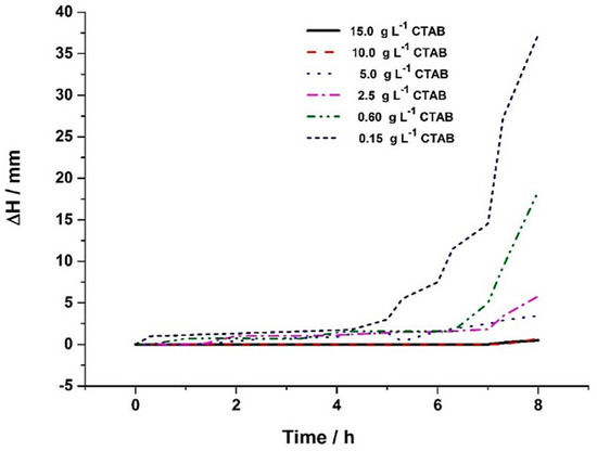 In Figure 2 it is possible to observe the thickness variation of the diluted phase (ΔH) as a function of time, in colloidal suspensions with different concentrations of SiC particles. The results indicate that an increase in the concentration of SiC particles in the colloidal suspensions cause a significant decrease in the values of the thickness variation of the clarifying layer (ΔH) as a function of time. Lower values of ΔH were obtained for the highest concentrations of SiC particles (15 and 10 g L−1). After 8 h of experimentation, the ΔH value of the colloidal suspensions with both 15 and 10 g L−1 SiC was only 0.5 mm, whereas, for the suspension with 0.15 g L−1 SiC, ΔH was 37 mm in the same period.
