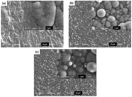 Figure 5 shows SEM micrographs of the Co-B/SiC composite coatings formed from colloidal suspensions with variation in SiC content (i.e., Co-B/SiC coatings with different at.% SiC). The results indicate that from electrolytic solutions without SiC (Figure 5a) (0 at.% SiC in the coating), a compact, smooth, adherent, and shiny Co-B coating was formed. Additionally, microcracks were observed on the surface of the coating, indicative of high internal stress in the coating possibly due to the evolution of hydrogen during electrodeposition. The inset of Figure 5a shows the amorphous structure of the Co-B coating. In contrast, occlusion of SiC particles in the metal matrix caused a transition in morphology toward a more crystalline structure of the Co-B/SiC composite coatings obtained (see Figure 5b (1.76 at.% SiC), Figure 5c (2.56 at.% SiC)). Semispherical structures of nanometric size were formed on top of the clusters. In addition, as a result of increasing the content of SiC in the coatings, the size and amount of the surface microcracks decreased, which was indicative of a lower level of stress inside the coatings. This behavior was associated with an inhibition of the hydrogen evolution reaction, due to the adsorption of the CTAB dispersant on the surface of the substrate.