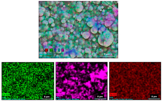 The elementary mapping analysis obtained from the surface of the Co-B/SiC (2.56 at.% SiC) coating (Figure 6) evidenced the homogeneous distribution of the SiC particles on the surface of the coating. These results, together with the GDS results shown in the previous section, confirmed the homogeneous incorporation of the SiC particles in the Co-B metal matrix: For all Co-B/SiC composite coatings with different SiC content, the same behavior was observed. This behavior was the result of improving the migration of the SiC particles toward the negatively charged electrode surface (cathode) due to the increase in the positive electric charge of the SiC particles that occurred because of the adsorption of the cationic dispersant CTAB on the surface of the SiC particles [24].