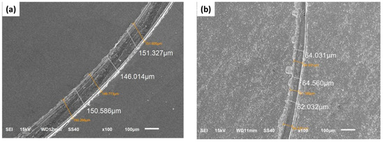 To identify the wear mechanism of the coatings, we analyzed the worn surface of the Co-B/SiC composite coatings with different SiC contents by SEM. In the Co-B coatings (Figure 9a), the presence of torn patches and some detachment within the worn tracks was typical evidence of a plastic deformation being carried out in this process, which indicated that the principal mechanism was adhesive wear. Moreover, by increasing the SiC particle content up to 2.5 at.% SiC (Figure 9b), it was possible to observe the formation of the thinner grooves on the worn surface. This behavior was evidence of the beneficial effect of the incorporation of SiC, which improved wear resistance and low friction. Similar behavior was observed in the wear tests of all the Co-B / SiC composite coatings obtained. Additionally, as shown in Figure 9, the Co-B/SiC coating with 2.5 at.% SiC (Figure 9b) exhibited the shallowest ploughed lines and narrowest width. These results indicated that this coating exhibited the best behavior for wear resistance.