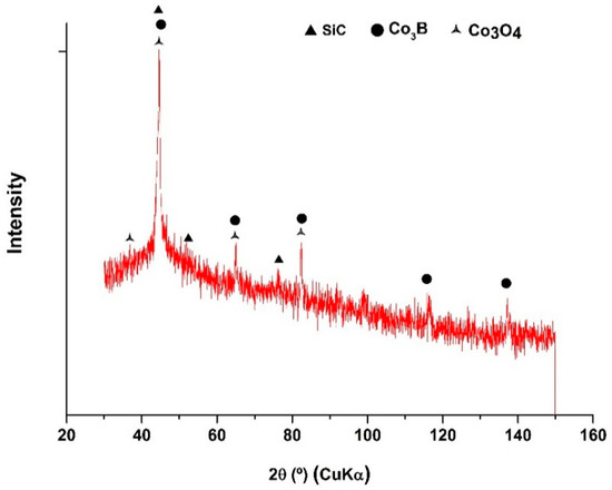 Therefore, the increase in hardness was mainly associated with the crystallization of the hard intermetallic species Co3B, which occurred between 200 and 400 °C and was further confirmed by XRD patterns (Figure 11). In Figure 11, the XRD patterns show that when the Co-B/SiC (2.56 at.% SiC) coating was thermally treated at 350 °C, a material more crystalline is obtained and peaks corresponding to crystalline Co3B and Co3O4 appeared. Similar behavior was obtained from all Co-B/SiC coatings analyzed.