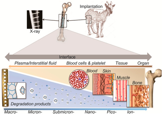 Schematic of potential interaction between an absorbable metal-local tissue interactions followed by the body response. Corrosion starts as the implant is inserted, then the tissue reacts to this foreign body. Corrosion products formed and released into the tissue are fragmented from micron size down to ions, transported by the blood cells and passed into different tissue depending on the implantation site, i.e., bone, muscle, skin, etc.