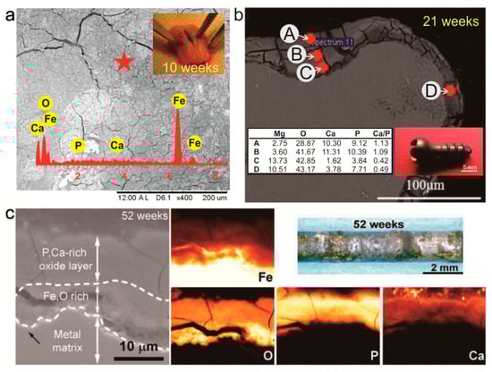 Scanning Electron Microscope-Energy-Dispersive X-ray Spectroscopy (SEM-EDS) analysis on the corrosion product of some retrieval implants: (a) surface of an Fe-bioceramic plate after 10 weeks implanted in sheep having undissolved corrosion product; (b) cross section of AZ31B Mg alloy screw after 21 weeks implanted in rabbit with attached corrosion product having different chemical compositions at different points on the surface; (c) cross section of pure Fe pin after 52 weeks implanted in rat showing the composition of corrosion product on the surface that differs depending on the distance from the implant interface. Adapted with permission from Elsevier and John Wiley and Sons [13,52,53].