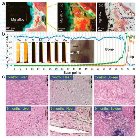 Example of local and systemic histological assessment of tissue-implant interaction: (a) fluorescence image of Villanueva stain on Mg alloy-contained femoral bone of New Zealand white rabbits after 26 weeks of implantation indicating a formation or differentiation of bone cells at the tissue-implant interface, which would not appear when using general stain of Hematoxillin-Eosine; (b) Micro X-ray Fluorescence (µXRF) elemental mapping of explanted WZ21 Mg alloy from femoral bone of a Sprague-Dawley rat after 12 months of implantation showing an elemental map that helps to understand the spreading of corrosion product in the vicinity of the implant; (c) Prussian blue stain image of liver, heart and spleen of mice after nine months of exposure to Fe stent implantation depicting corrosion product deposit in the organ of interest as a way of systemic evaluation of organs toxicity. Adapted with permission from John Wiley and Sons [55,56,58].