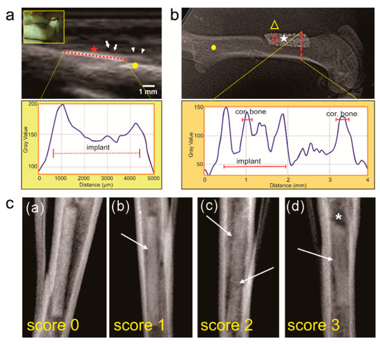 Ultrasonography (USG) uses a very high frequency sound waves (>20,000 Hz) to image soft tissue, enabling it to produce a real-time image at different gray scale degrees [52]. The sound wave is reflected by the tissue at different level of echogenicity: hyperechoic (high reflective) by gas-contained and hard tissue, hypoechoic by soft tissue, and anechoic (no reflection) by fluid. The USG’s echogenicity was analyzed using ImageJ software (NIH, USA) to quantitatively assess the corrosion of the Fe-bioceramic implant in sheep (Figure 4a) [51]. Different from USG, radiography and tomography use X-rays to produce diagnostic images and is considered as a gold standard for hard tissue monitoring of metal implants. The instrument emits X-rays that are attenuated when they pass through, are reflected or absorbed by the target tissue. Only the pass through X-rays are received by X-ray film or digital X-ray sensors to produce images [59,60]. Tissue characteristics, such as thickness, density, type of tissue and presence of implant or corrosion product can be differentiated from the gray scale of the 2D X-ray images [61]. The gray scale variation indicates some changes both on the implant and the tissue where tissue change becomes more visible around an active (corroding) implant than an inert one [59]. The line-plot profile module of ImageJ software was used to analyze the radiography images of porous Fe implanted in the femoral bone of rat (Figure 4b) [51]. Another analysis uses a radiographic scoring system as a qualitative approach, which was applied to assess the variation of the structure and shape of the femur of New Zealand white rabbits after being implanted with LANd442 Mg alloy pin for over 4–10 weeks (Figure 4c) [61,62].