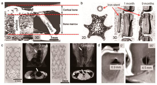 Tissue-implant interaction assessment: (a) Micro-Computed Tomography (µCT) image of a high-purity Mg pin implanted in the femur of New Zealand white rabbits after 16 weeks enabling the visualization of implant morphological change both on the surface and the internal architecture and reaction of the attached hard tissue; (b) µCT image of pure Fe stent after 1 and 9 months implanted in tail veins of mice allowing a follow-up of detail morphological change of the stent during the corrosion process; (c) Magnetic Resonance Imaging (MRI) image of Fe stent after 3 days and 13 months implantation in the abdominal aorta of rabbit showing the detail structural change of the stent; (d) MRI image of Mg Herbert screw in chicken femoral bone showing a lesser artifact produced by absorbable metal implant than by inert implant. Adapted with permission from Elsevier and John Wiley and Sons [22,58,63,65].
