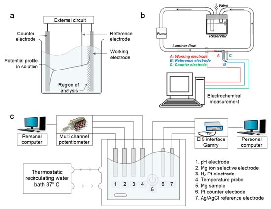 Electrochemical-based monitoring systems: (a) a three-electrode electrochemical cell of amperometric sensor; (b) an experimental setup to study the dynamic corrosion of an absorbable metal in-situ and in real time; (c) a corrosion characterization system instrument and cell configuration. Adapted with permission from Elsevier [39,66,67].