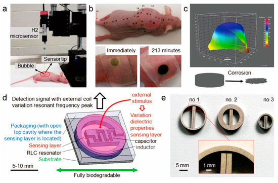 Sensor-based corrosion monitoring system: (a) hydrogen micro-sensor assembled on a micromanipulator for measuring hydrogen transdermally from a Mg alloy implanted subcutaneously in a mouse where the sensor tip is in a direct contact with the mouse skin; (b) photograph of an anaesthetized nude mouse with marked measurement points, and color development of thin film visual hydrogen sensor at two different observation times; (c) 3D reconstruction of the brightness change in the hydrogen sensor area at 213 min and associated volume change of the Mg implant; (d) design of a fully biodegradable sensor (wireless telemetry with inductive link); (e) resistor–inductor–capacitor (RLC) resonators made of absorbable materials. Adapted with permission from Elsevier and Springer Nature [72,74,75].