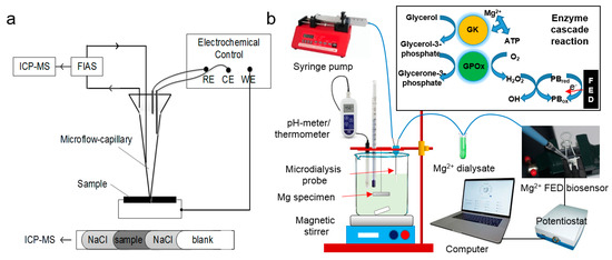 Experimental setup of: (a) micro-flow-capillary-coupled Inductively Coupled Plasma Mass Spectrometer (ICP-MS); (b) coupled microdialysis probe-fabric-based electrochemical device (FED) biosensor connected to a potentiostat (inset: dialysate is dropped at the reaction region of the biosensor that was immobilized with the GK and GPOx enzymes to detect Mg2+ ions via enzymes cascade reaction). Adapted with permission from Elsevier and Springer Nature [82,83].