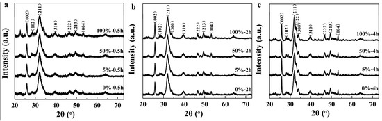 X-ray diffraction patterns of samples synthesized with different RAMP values and hydrothermal times: (a) 0.5 h; (b) 2 h; (c) 4 h.