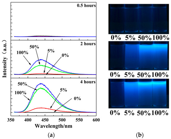 Figure 2 depicts the photoluminescence emission spectrum of samples synthesized with different RAMP and hydrothermal times, excited with 340-nm UV light. When the hydrothermal time was less than 0.5 h, no fluorescence was observed, no matter how the RAMP was changed. When the hydrothermal time was 2 h, the fluorescence intensity of samples increased, and the RAMP increased from 5% to 100%. The maximum fluorescence peak of the samples was approximately 440 nm, which essentially did not change as the RAMP changed. The sample synthesized with sodium phosphate as the phosphate source was not fluorescent. When the hydrothermal time increased to 4 h, the trends were very similar with those of the samples synthesized for 2 h, yet the fluorescence intensity was higher. The sample synthesized with sodium phosphate as the phosphate source for 4 h still did not have fluorescence. The observation of the corresponding dispersions of samples under a 365-nm UV lamp validated the results of the fluorescence spectrum.