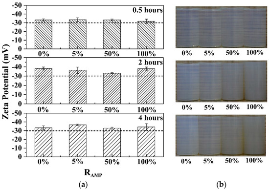 (a) Zeta potential diagram of samples synthesized with different hydrothermal times and RAMP values. (b) corresponding photos of samples standing for one week under natural light.