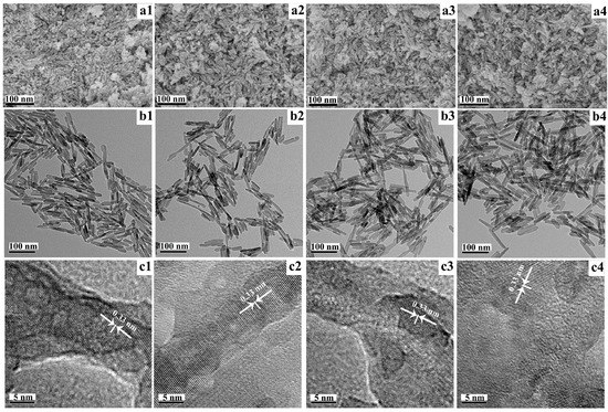 SEM, TEM, and high-resolution transmission electron microscopy (HR–TEM) images of samples synthesized at different RAMP values, with 4 h of hydrothermal treatment. 0% (a1,b1,c1), 5% (a2,b2,c2), 50% (a3,b3,c3), and 100% (a4,b4,c4).