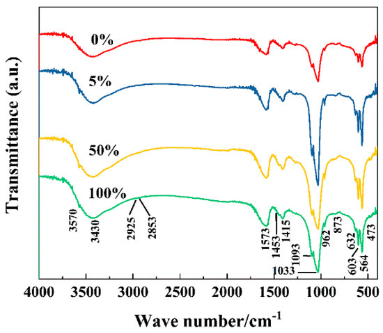 To further understand the dehydration reactions during HA hydrothermal synthesis, an FTIR spectrum was employed to investigate the changes of samples synthesized with different RAMP values (Figure 5). Table 5 summarizes the results.