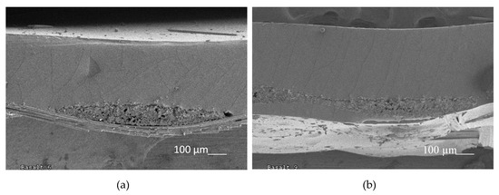 Scanning electron microscopy (SEM) images of (a) Basalt 6 and (b) Basalt 9 sections showing greater penetration of the silicone into the fabric at a higher add-on.