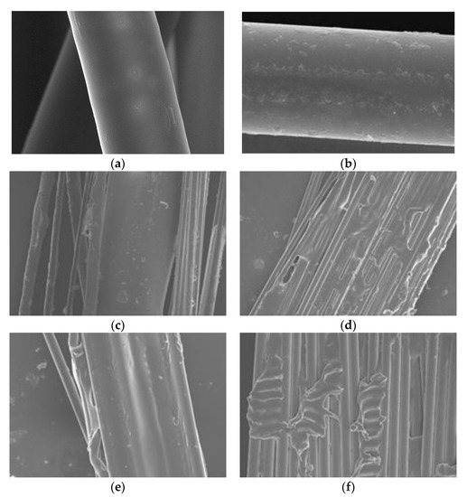 SEM images of basalt fibres: (a) un-sized (Basalt 1), and (b) plasma-treated (Basalt 11); (c) un-sized/silicone-coated CR 173% (Basalt 4); (d) plasma-treated/silicone-treated CR 183% (Basalt 6); (e) un-sized/silicone-coated CR 261% (Basalt 5); (f) plasma-treated/silicone-coated CR 256% (Basalt 9).