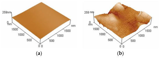 A three-dimensional SPM surface morphology of basalt and plasma-treated fibres shows further microscopic changes on the fibre surface, as shown in Figure 3a,b. The surface morphology of the un-sized fibre is relatively flat, clean, and smooth, which is consistent with the SEM images Figure 2a and the nature of the basalt fibre. An increase in roughness of the plasma-treated fibre can be seen in Figure 3, relative to the un-sized fibre. The surface roughness of the un-sized fibre varied between 5.43 to 10.1 nm (with an average of 5.62 nm and a root mean square of 6.25 nm), whereas that of the plasma-treated fibre varied between 15.9 and 25.9 nm (with an average of 22.3 nm and a root mean square of 28.6 nm). Consistent with the SEM images, an increase in surface area and interlocking between the fibre/silicone-elastomer interfaces could be expected after plasma treatment [31].