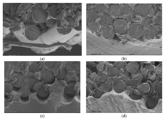 Cross-sectional images of basalt fibres: (a) un-sized/silicone-coated CR 173% (Basalt 4); (b) plasma-treated/silicone-treated CR 183% (Basalt 6); (c) un-sized/silicone-coated CR 261% (Basalt 5); (d) plasma-treated/silicone-coated CR 256% (Basalt 9).