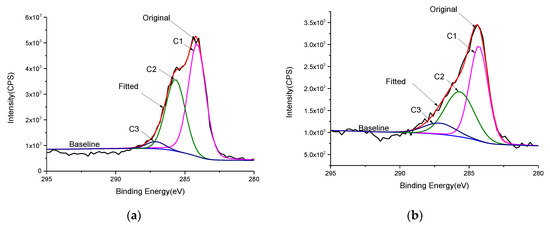 The C 1s high-resolution spectra is showed in Figure 4. Three components were fitted to the original curve. According to the binding energy, the peak at about 284.13 eV is typical of carbon without oxygen bonds and is only bound to carbon and hydrogen C1 (C–C, C–Hx). The peak at higher bonding energy (285.68 eV) is typical of carbon single bond to oxygen and or nitrogen C2 (C–O, C–O–C), and the peak near 287.12 eV corresponds to carbon with two oxygen and/or nitrogen bonds C3 (O–C–O, N–C=O) [32].