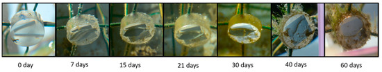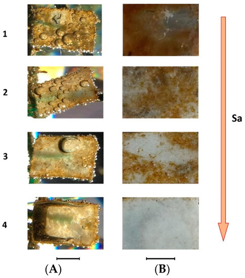 On the left side of the Figure 7, it is possible to observe the bubbles’ volume, and it is evident that their extension increases with samples roughness. On the right side of the figure, samples after extraction are reported. Some of those present parts of the coating are not affected by biofouling. Comparing the images before and after extraction, it is possible to affirm that where a large bubble was present, biofouling growth was inhibited or delayed.