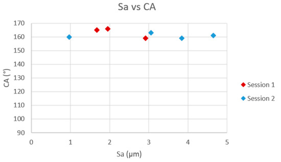 Contact angle (CA) of the samples of the two session with respect to surface roughness (Sa) before immersion. Red dots—session 1, blue dots—session 2.