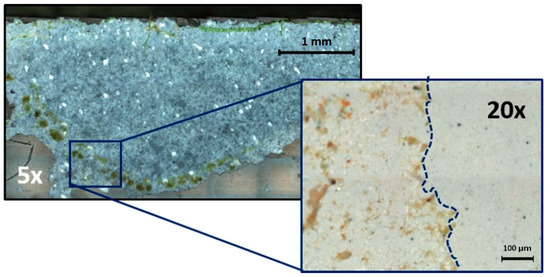 The evidence of fouling growth inhibition was investigated by optical microscopy and SEM analysis in order to evaluate the real foul control behaviour due to the presence of bubbles on samples at the end of the exposition. In Figure 8, an LOM image at 5× and 20× of PS/PTFE sample is shown. At low magnification, it is already possible to distinguish the part of the sample that was covered by bubbles.