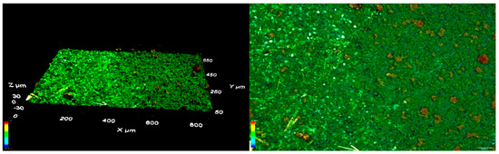 A similar observation was carried out by 3D profilometer, taking images on the bubble edge. In Figure 10, it is possible to observe the presence of biofouling on the portion of the surface not covered by the bubble, instead of a clean surface where the bubble was present. Furthermore, an analysis on the clean part evidenced that there was not a significant loss of material in terms of Sa.