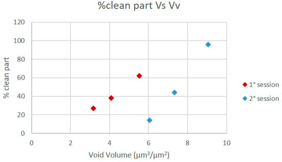 In Figure 11, the results about session 1 and 2 are reported. From Figure 11, it is possible to observe that the percentage of the clean part increases with void volume in both sessions.