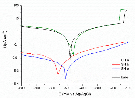 The particular case of the SHa polarization curve indicates that the SH coating was not efficient In fact, for this sample, SH coating defects at the electrode–resin interface were observed, causing the electrode to work as the bare reference.