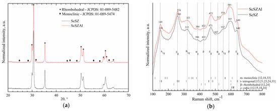 ScSZ and ScSZAl powders: (a) X-ray diffraction (XRD) patterns and (b) Raman shifts.