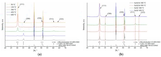 Therefore, the vapor phase of ScSZ and ScSZAl powders could consist of ZrO2, ZrO, O2, O, Sc2O3, Sc2O2, ScO, Sc, Al2O3, Al2O2, AlO, Al atoms, molecules, and molecule fragments. The atoms and molecule fragments landed on the surface of the substrate migrate and form grains. The grains with the densest planes are selected, e.g., (111) for face-centered cubic. However, surface diffusivity plays an important role in the formation of textured thin films. Adatoms deposited near grain boundaries have a higher probability of becoming incorporated at a low diffusivity surface in comparison to adatoms at high diffusivity planes having longer mean free paths with correspondingly higher probabilities of moving off the plane and becoming trapped on the adjacent grains [36]. Therefore, grains with low surface diffusivities grow faster. A similar growth mechanism was observed in the ScSZ and ScSZAl thin films. The thin films have a cubic structure (Figure 2a) and the positions of (111), (200), (220), (311), and (222) orientation peaks in the XRD patterns (measured at room temperature) confirm this (JCPSD No. 01-089-5483). The preferential orientation is (200) at low temperature (up to 450 °C) and preferential orientation is (111) at high temperatures because adatoms have high enough diffusion energy to move on the surface and become trapped on the high diffusivity surfaces. Moreover, the positions of the peaks of the ScSZAl thin films are shifted to higher angles by 0.2° in comparison to the positions of the peaks of the ScSZ thin films (Figure 2b) due to distortions in the crystal lattice. The ion of Al (~0.53 Å) is smaller than the ion of zirconium (0.84 Å).