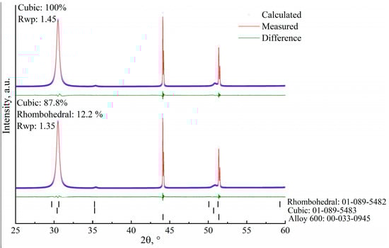However, Rietveld analysis showed that a mixture of cubic (87.8%) and rhombohedral (12.2%) phases can be found in the ScSZAl thin films (Figure 3) with equal probability as a pure cubic phase. The weighted profile R-factors (Rwp) are almost the same for pure cubic (1.45) and the mixture of cubic and rhombohedral (1.35). Therefore, the peaks of cubic and rhombohedral phases can be overlapped [17,35]. In this case, XRD patterns require a complimentary analysis and Raman spectroscopy can be a quick solution [15,21].